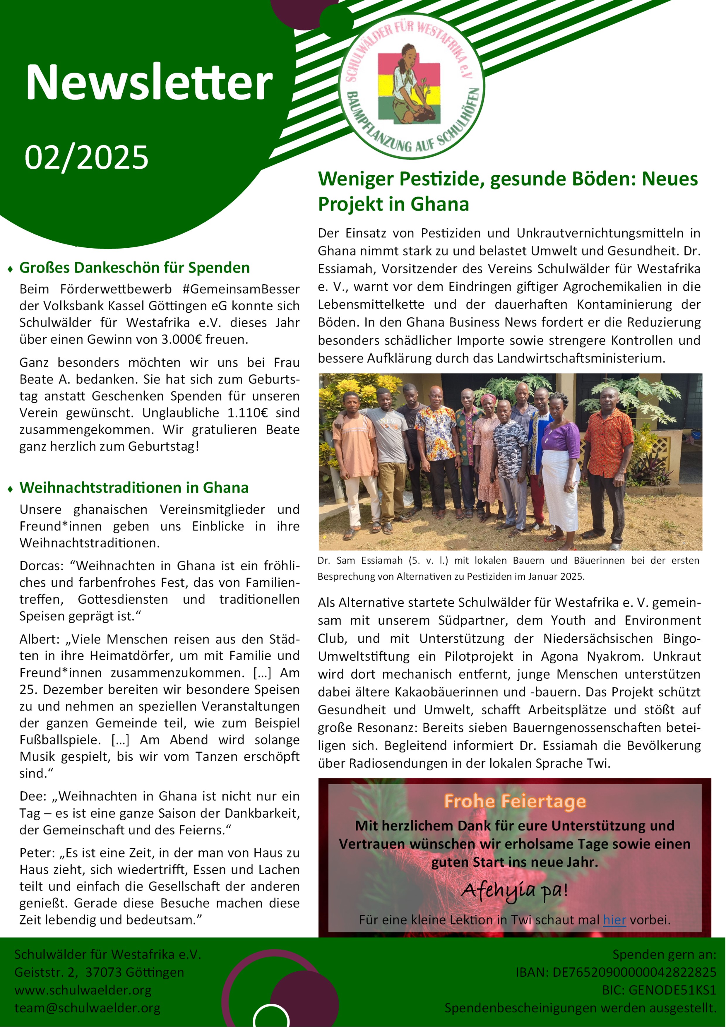 Wieder ist ein Jahr mit vielen Aktivitäten zu Ende gegangen. Wir blicken auf zahlreiche Momente des Engagements zurück: Viele Schülerinnen und Schüler, Lehrerinnen und Lehrer, Spenderinnen und Spendern sowie ehrenamtliche Vereinsmitglieder haben sich in Ghana und Deutschland unermüdlich für den Schutz der Natur, den Erhalt des Regenwaldes und die Verbreitung von Umweltwissen eingesetzt. Wir möchten uns bei Ihnen allen herzlich bedanken! Ohne Ihre Unterstützung wäre unsere Vereinsarbeit so nicht möglich gewesen.